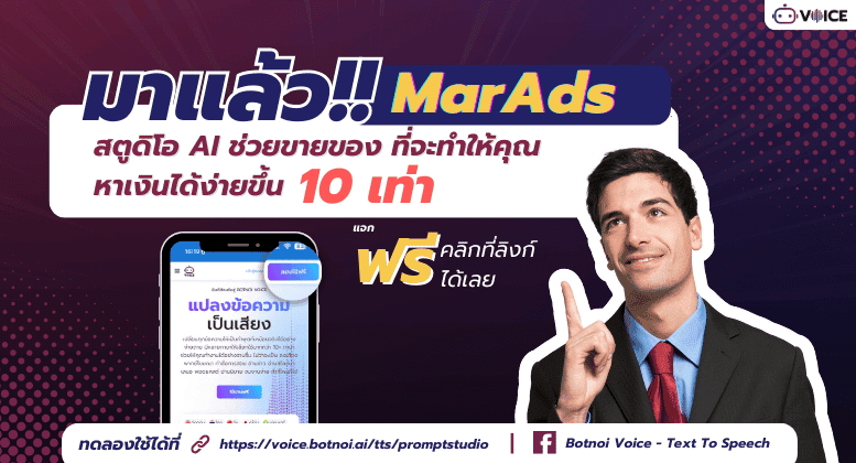 All sellers can now use this new feature on the BOTNOI VOICE website from any device, be it a phone, tablet, or computer. To access the MarAds studio, go to the top right corner of the website, select MarAds, and don’t forget to log in if you already have an account. If not, you can create an account using Google or LINE and instantly receive 500 points.